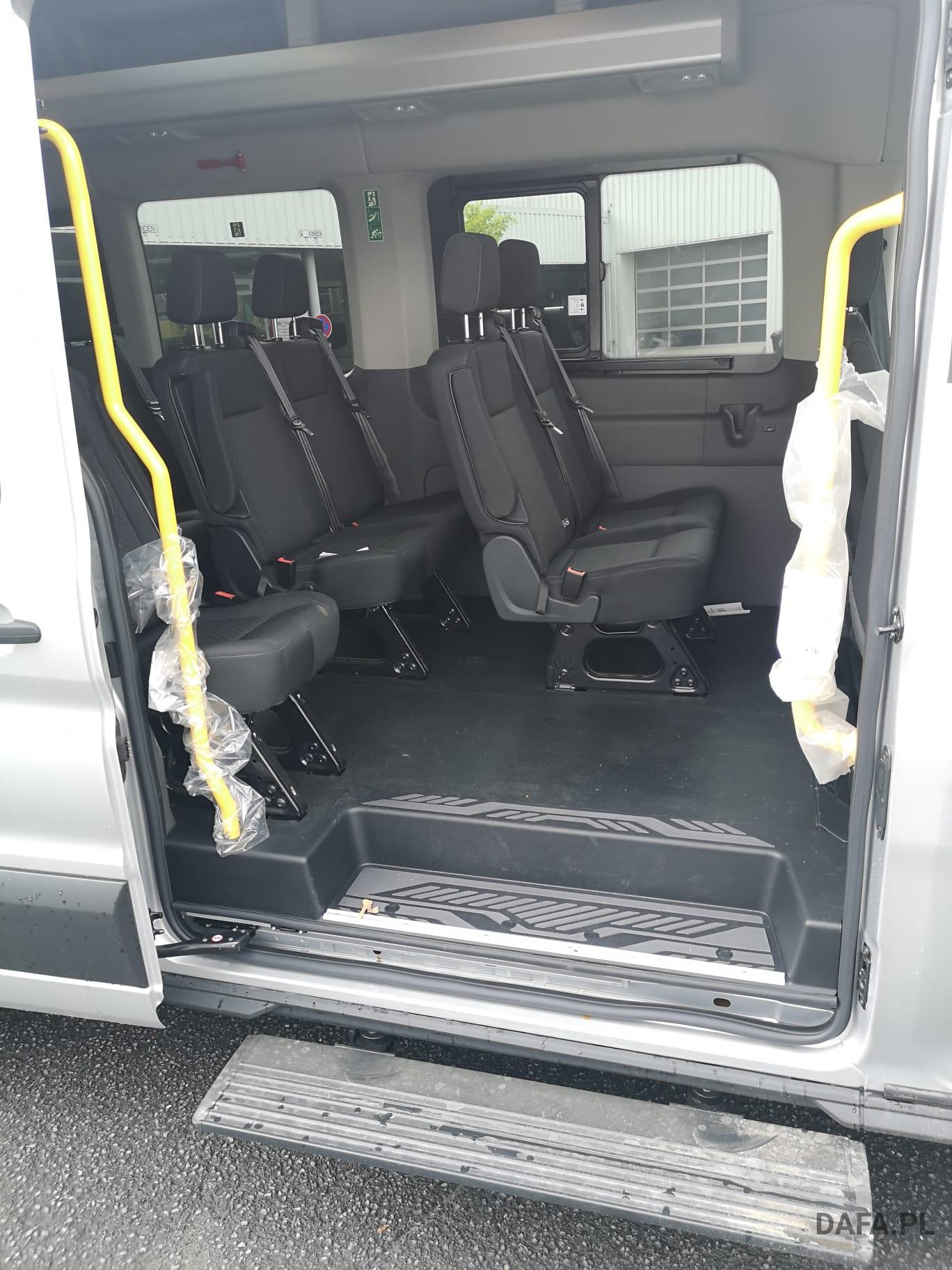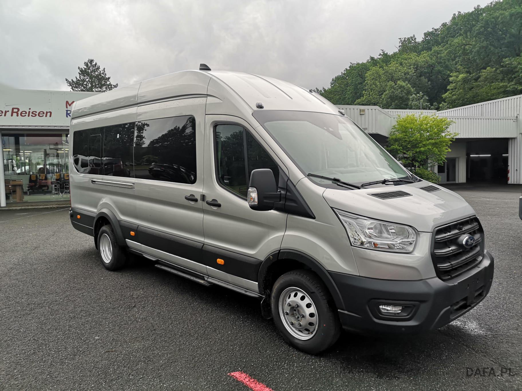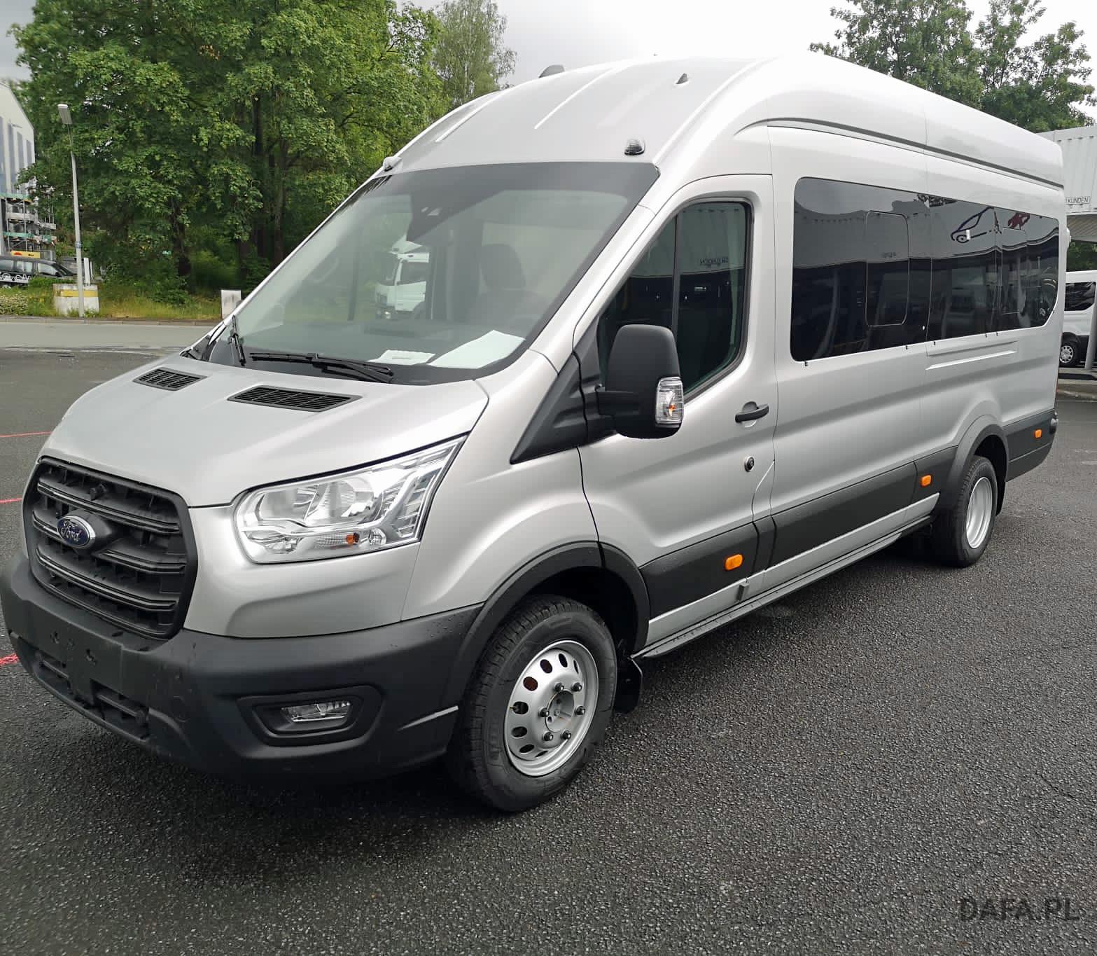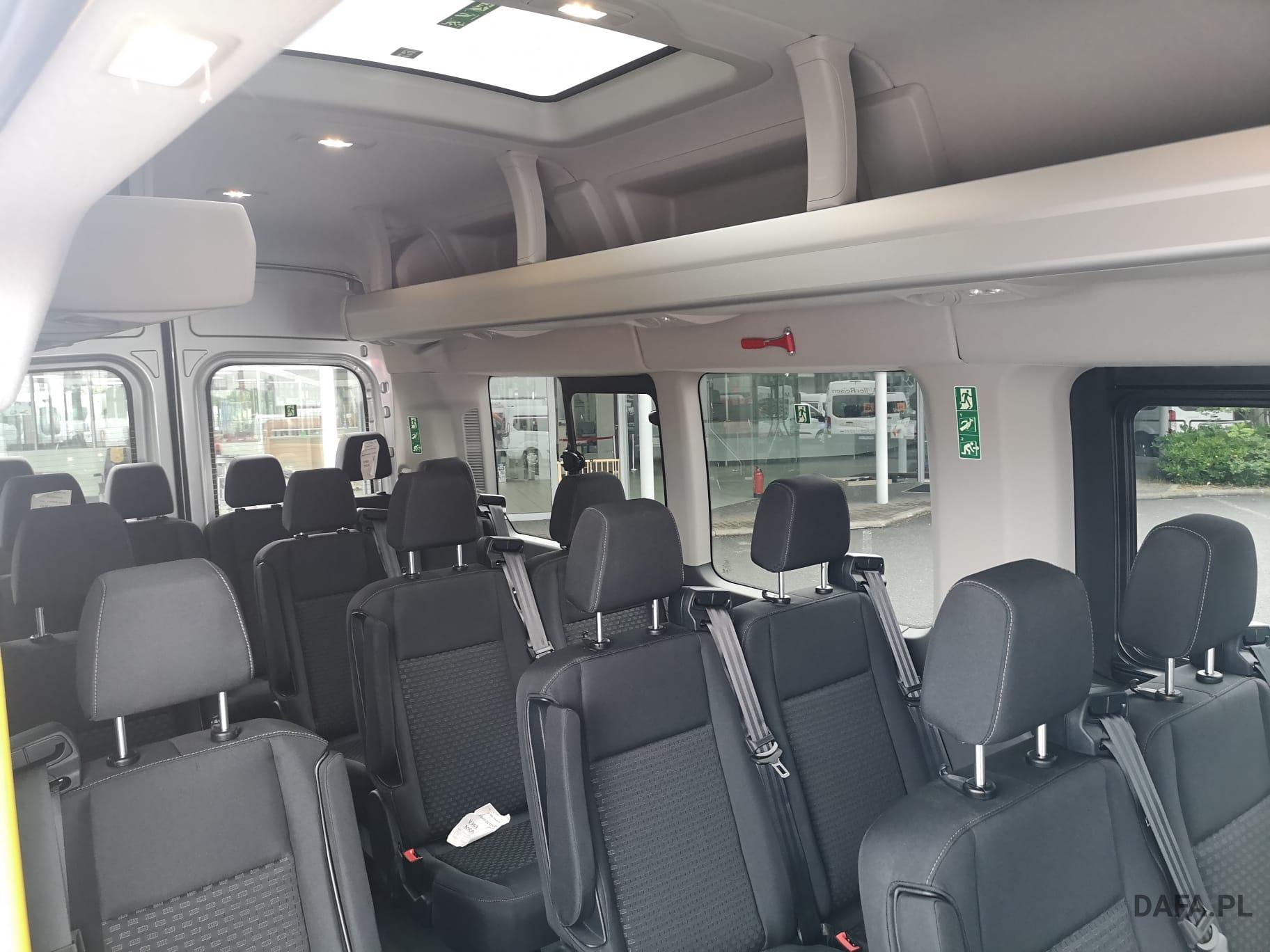 Lusterka zewnętrzne elektrycznie regulowane, podgrzewane i składane - ze zintegrowanymi kierunkowskazami. Reflektory ze statycznym doświetlaniem zakrętów Przedni chlapacz Gniazdo: złącze 12 V w bagażniku (słupek D) lusterko zewnętrzne elektr. składane, okno w przestrzeni ładunkowej/FG: - przesuwne, 2 rząd prawy, drzwi tylne skrzydłowe z przeszkleniem (kąt otwarcia 256 stopni), chlapacze z przodu, gniazdo 12V w przestrzeni ładunkowej/pasażerskiej 2 akumulatory/poduszka powietrzna (pasażer boczne) / poduszka powietrzna po stronie kierowcy (ABS ) z elektronicznym rozdziałem siły hamowania (EBD) - (ESP) z kontrolą trakcji (TCS) - Wspomaganie ruszania pod górę - Asystent bocznego wiatru – asystent hamowania bezpieczeństwa – zabezpieczenie przed dachowaniem – wspomaganie hamowania awaryjnego ze światłem hamowania awaryjnego – dodatkowo ze stabilizacją przyczepy tylko w połączeniu z zaczepem przyczepy (za dopłatą) - Lusterka zewnętrzne, elektrycznie regulowane i podgrzewane - ze zintegrowanymi kierunkowskazami - Podłoga gumowana (w kabinie kierowcy i przedziale pasażerskim) - Dach komputera pokładowego, wysoki - wraz z bagażnikiem wzdłużnym w kabinie pasażerskiej - Dach, schowek podsufitowy, przednia podsufitka kompletna Dwuskrzydłowe tylne drzwi o kącie otwarcia 256° (z oknem) - z podgrzewanymi tylnymi szybami - obrotomierz - Trzecie światło hamowania - Okno: okno na zawiasach, 4. rząd po lewej i prawej stronie - Przednie szyby elektryczne - Gaśnica - przed siedzeniem w przypadku podwójnego siedzenia pasażera - obok w przypadku pojedynczego siedzenia pasażera Hamulec ręczny — Ford Easy Fuel — wygodny korek wlewu paliwa i ochrona przed zatankowaniem niewłaściwego paliwa - Podgrzewana przednia szyba - Ogranicznik prędkości 100 km/h - Skrzynia biegów: 6-biegowa skrzynia biegów - Zamykany schowek z pokrywą - Opóźnione oświetlenie wnętrza przednimi lampkami do czytania - Oświetlenie wnętrza: oświetlenie przedziału pasażerskiego z obwodem opóźniającym - Klimatyzacja tylna - w tym klimatyzator tylny z nagrzewnicą wodną - Zbiornik paliwa 70 l Lakier: met - Kolumna kierownicy z regulacją wysokości i zasięgu - System kluczyków MyKey - indywidualnie programowalny drugi kluczyk - Pakiet: pakiet tylnych siedzeń 8 - 17/18 miejsc - 1. rząd: podwójne siedzenie po lewej stronie ze wspornikiem ISOFIX - 2. rząd: podwójne siedzenie po lewej, pojedyncze siedzenie po prawej - 3. rząd: podwójne siedzenie po lewej, pojedyncze siedzenie po prawej - 4. Rząd: podwójne siedzenie po lewej, pojedyncze siedzenie po prawej - 5. rząd: rząd czterech siedzeń (podwójne siedzenie środkowe/pojedyncze siedzenia zewnątrz)) - pakiet: pakiet technologiczny 9 - szyba przednia podgrzewana - wycieraczki szyby przedniej z czujnikiem deszczu - system parkowania z przodu iz tyłu - asystent hamowania awaryjnego, aktywny (oparty na kamerze) - asystent pasa ruchu / parktronic z ostrzeżeniem o zmęczeniu i asystentem świateł drogowych ; dodatkowo z asystentem utrzymania pasa ruchu - asystentem reflektorów z czujnikiem dzień/noc - tempomat - światła przeciwmgielne - system audio Ford - Filtr cząstek stałych: Filtr cząstek stałych - Radio: System audio Ford z 4-calowym wyświetlaczem wielofunkcyjnym - Podłączone radio (FM/AM) - Odbiór radia cyfrowego DAB/DAB+ (Digital Audio Broadcasting) - Informacje FordPass Connect o aktualnym stanie, lokalizacji i sterowaniu z aplikacją FordPass - Wyświetlacz wielofunkcyjny TFT 4" (przekątna ekranu 10,16 cm) - Cztery głośniki, antena Zintegrowany panel sterowania i pilot audio na kierownicy - Interfejs Bluetooth, port USB i zestaw głośnomówiący - Asystent połączenia alarmowego - Wsparcie dla Android Auto i Apple CarPlay – Koła: Podwójne opony – Stalowe felgi 6 J x 16 z oponami 195/75 R 16 - Reflektory halogenowe świateł mijania ze światłami do jazdy dziennej - Drzwi przesuwne: Drzwi przesuwne prawe Stopień drzwi przesuwnych prawe elektryczne - Chlapacze tylne Boczne listwy ochronne Poszycie ścian bocznych wysokie Wspomaganie kierownicy Fotele w przedziale pasażerskim: regulowane oparcia foteli - podłokietniki do przejścia fotele: pakiet 13 - fotel kierowcy regulowany w 4 kierunkach (przód/tył, oparcie, nachylenie siedziska, Wysokość) - Podwójne siedzenie pasażera ze schowkiem pod indywidualnie składanymi poduszkami siedzeń - Zagłówki z regulacją wysokości, podłokietnik dla kierowcy wewnątrz - Podparcie lędźwi, manualne (siedzenie kierowcy) - Pokrycie siedzenia: tkanina Zderzak tylny z systemem Start-Stop ze zintegrowanym stopniem - tachograf przedniego zderzaka, cyfrowy immobiliser, szyby termoizolacyjne, przyciemniane średnio (od słupka B) - centralny zamek z pilotem - 2 kluczyki w tym jeden z pilotem centralny zamek z pilotem - dodatkowo z drugim kluczykiem , składany, ze zdalnym sterowaniem z ogrzewaniem postojowym centralnego zamka, elektrycznym (PTC)