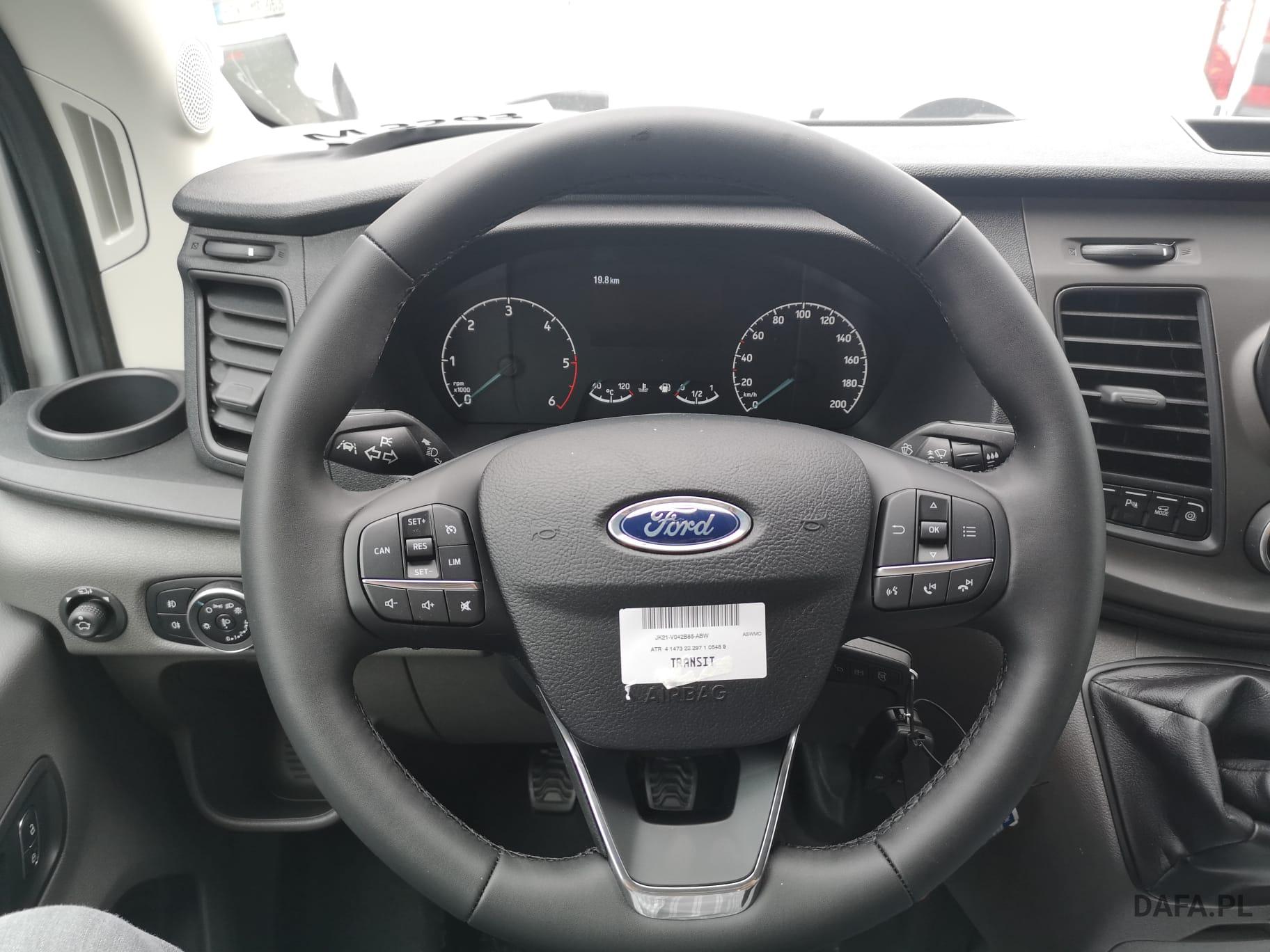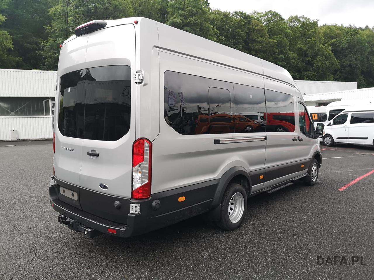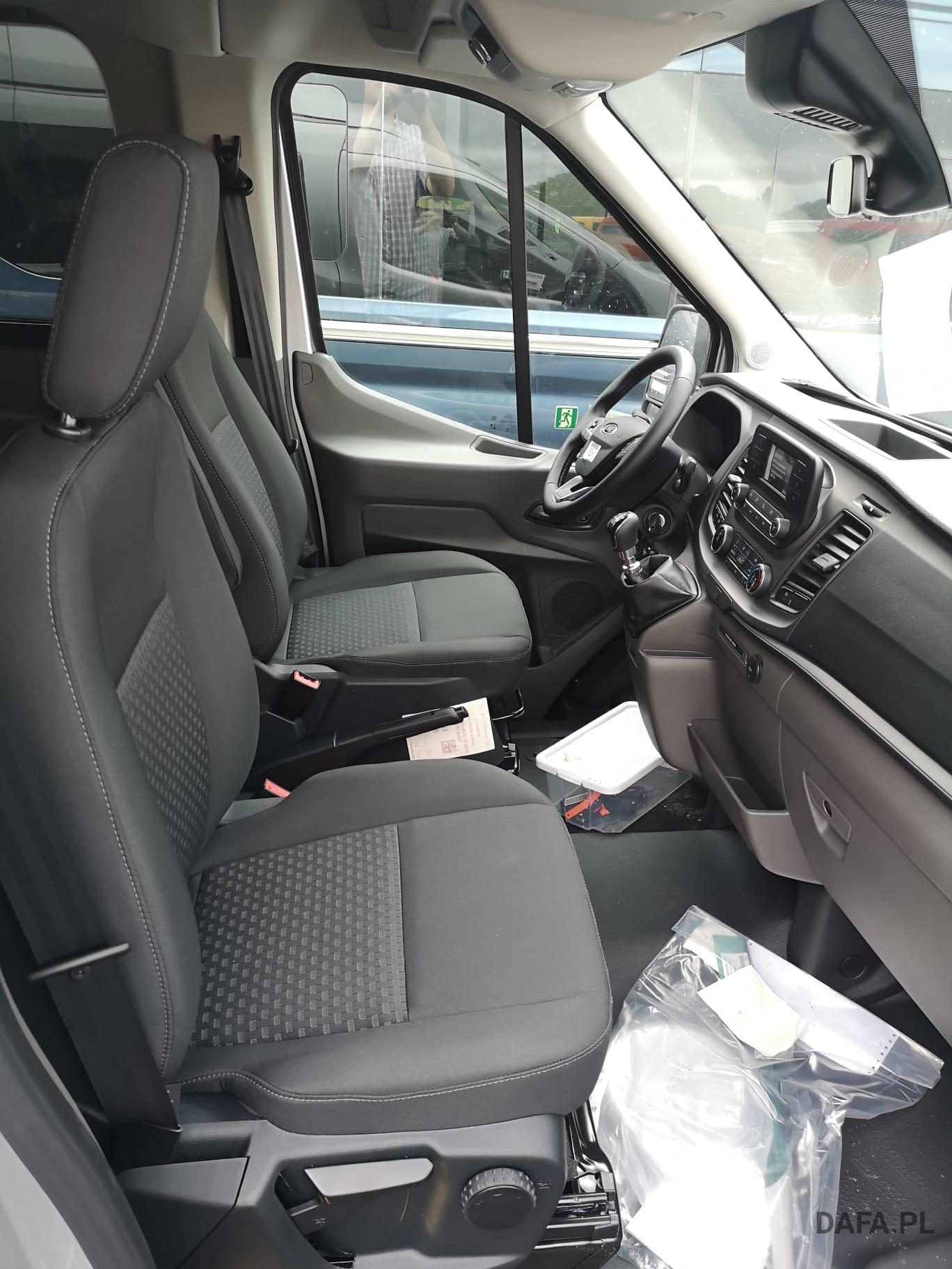 Lusterka zewnętrzne elektrycznie regulowane, podgrzewane i składane - ze zintegrowanymi kierunkowskazami. Reflektory ze statycznym doświetlaniem zakrętów Przedni chlapacz Gniazdo: złącze 12 V w bagażniku (słupek D) lusterko zewnętrzne elektr. składane, okno w przestrzeni ładunkowej/FG: - przesuwne, 2 rząd prawy, drzwi tylne skrzydłowe z przeszkleniem (kąt otwarcia 256 stopni), chlapacze z przodu, gniazdo 12V w przestrzeni ładunkowej/pasażerskiej 2 akumulatory/poduszka powietrzna (pasażer boczne) / poduszka powietrzna po stronie kierowcy (ABS ) z elektronicznym rozdziałem siły hamowania (EBD) - (ESP) z kontrolą trakcji (TCS) - Wspomaganie ruszania pod górę - Asystent bocznego wiatru – asystent hamowania bezpieczeństwa – zabezpieczenie przed dachowaniem – wspomaganie hamowania awaryjnego ze światłem hamowania awaryjnego – dodatkowo ze stabilizacją przyczepy tylko w połączeniu z zaczepem przyczepy (za dopłatą) - Lusterka zewnętrzne, elektrycznie regulowane i podgrzewane - ze zintegrowanymi kierunkowskazami - Podłoga gumowana (w kabinie kierowcy i przedziale pasażerskim) - Dach komputera pokładowego, wysoki - wraz z bagażnikiem wzdłużnym w kabinie pasażerskiej - Dach, schowek podsufitowy, przednia podsufitka kompletna Dwuskrzydłowe tylne drzwi o kącie otwarcia 256° (z oknem) - z podgrzewanymi tylnymi szybami - obrotomierz - Trzecie światło hamowania - Okno: okno na zawiasach, 4. rząd po lewej i prawej stronie - Przednie szyby elektryczne - Gaśnica - przed siedzeniem w przypadku podwójnego siedzenia pasażera - obok w przypadku pojedynczego siedzenia pasażera Hamulec ręczny — Ford Easy Fuel — wygodny korek wlewu paliwa i ochrona przed zatankowaniem niewłaściwego paliwa - Podgrzewana przednia szyba - Ogranicznik prędkości 100 km/h - Skrzynia biegów: 6-biegowa skrzynia biegów - Zamykany schowek z pokrywą - Opóźnione oświetlenie wnętrza przednimi lampkami do czytania - Oświetlenie wnętrza: oświetlenie przedziału pasażerskiego z obwodem opóźniającym - Klimatyzacja tylna - w tym klimatyzator tylny z nagrzewnicą wodną - Zbiornik paliwa 70 l Lakier: met - Kolumna kierownicy z regulacją wysokości i zasięgu - System kluczyków MyKey - indywidualnie programowalny drugi kluczyk - Pakiet: pakiet tylnych siedzeń 8 - 17/18 miejsc - 1. rząd: podwójne siedzenie po lewej stronie ze wspornikiem ISOFIX - 2. rząd: podwójne siedzenie po lewej, pojedyncze siedzenie po prawej - 3. rząd: podwójne siedzenie po lewej, pojedyncze siedzenie po prawej - 4. Rząd: podwójne siedzenie po lewej, pojedyncze siedzenie po prawej - 5. rząd: rząd czterech siedzeń (podwójne siedzenie środkowe/pojedyncze siedzenia zewnątrz)) - pakiet: pakiet technologiczny 9 - szyba przednia podgrzewana - wycieraczki szyby przedniej z czujnikiem deszczu - system parkowania z przodu iz tyłu - asystent hamowania awaryjnego, aktywny (oparty na kamerze) - asystent pasa ruchu / parktronic z ostrzeżeniem o zmęczeniu i asystentem świateł drogowych ; dodatkowo z asystentem utrzymania pasa ruchu - asystentem reflektorów z czujnikiem dzień/noc - tempomat - światła przeciwmgielne - system audio Ford - Filtr cząstek stałych: Filtr cząstek stałych - Radio: System audio Ford z 4-calowym wyświetlaczem wielofunkcyjnym - Podłączone radio (FM/AM) - Odbiór radia cyfrowego DAB/DAB+ (Digital Audio Broadcasting) - Informacje FordPass Connect o aktualnym stanie, lokalizacji i sterowaniu z aplikacją FordPass - Wyświetlacz wielofunkcyjny TFT 4" (przekątna ekranu 10,16 cm) - Cztery głośniki, antena Zintegrowany panel sterowania i pilot audio na kierownicy - Interfejs Bluetooth, port USB i zestaw głośnomówiący - Asystent połączenia alarmowego - Wsparcie dla Android Auto i Apple CarPlay – Koła: Podwójne opony – Stalowe felgi 6 J x 16 z oponami 195/75 R 16 - Reflektory halogenowe świateł mijania ze światłami do jazdy dziennej - Drzwi przesuwne: Drzwi przesuwne prawe Stopień drzwi przesuwnych prawe elektryczne - Chlapacze tylne Boczne listwy ochronne Poszycie ścian bocznych wysokie Wspomaganie kierownicy Fotele w przedziale pasażerskim: regulowane oparcia foteli - podłokietniki do przejścia fotele: pakiet 13 - fotel kierowcy regulowany w 4 kierunkach (przód/tył, oparcie, nachylenie siedziska, Wysokość) - Podwójne siedzenie pasażera ze schowkiem pod indywidualnie składanymi poduszkami siedzeń - Zagłówki z regulacją wysokości, podłokietnik dla kierowcy wewnątrz - Podparcie lędźwi, manualne (siedzenie kierowcy) - Pokrycie siedzenia: tkanina Zderzak tylny z systemem Start-Stop ze zintegrowanym stopniem - tachograf przedniego zderzaka, cyfrowy immobiliser, szyby termoizolacyjne, przyciemniane średnio (od słupka B) - centralny zamek z pilotem - 2 kluczyki w tym jeden z pilotem centralny zamek z pilotem - dodatkowo z drugim kluczykiem , składany, ze zdalnym sterowaniem z ogrzewaniem postojowym centralnego zamka, elektrycznym (PTC)